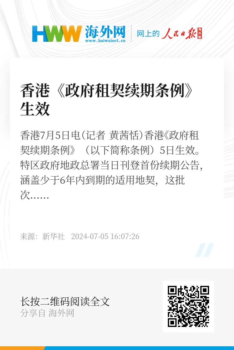 新华社香港7月5日电(记者 黄茜恬)香港《政府租契续期条例》(以下简称条例)5日生效。特区政府地政总署当日刊登首份续期公告,涵盖少于6年内到期的适用地契,这批次的地契全部获得续期,涉及376个地段,包括309个位于九龙以油尖旺区为主及67个位于香港岛的地段。