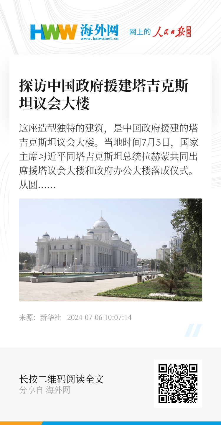 这座造型独特的建筑,是中国政府援建的塔吉克斯坦议会大楼。当地时间7月5日,国家主席习近平同塔吉克斯坦总统拉赫蒙共同出席援塔议会大楼和政府办公大楼落成仪式。