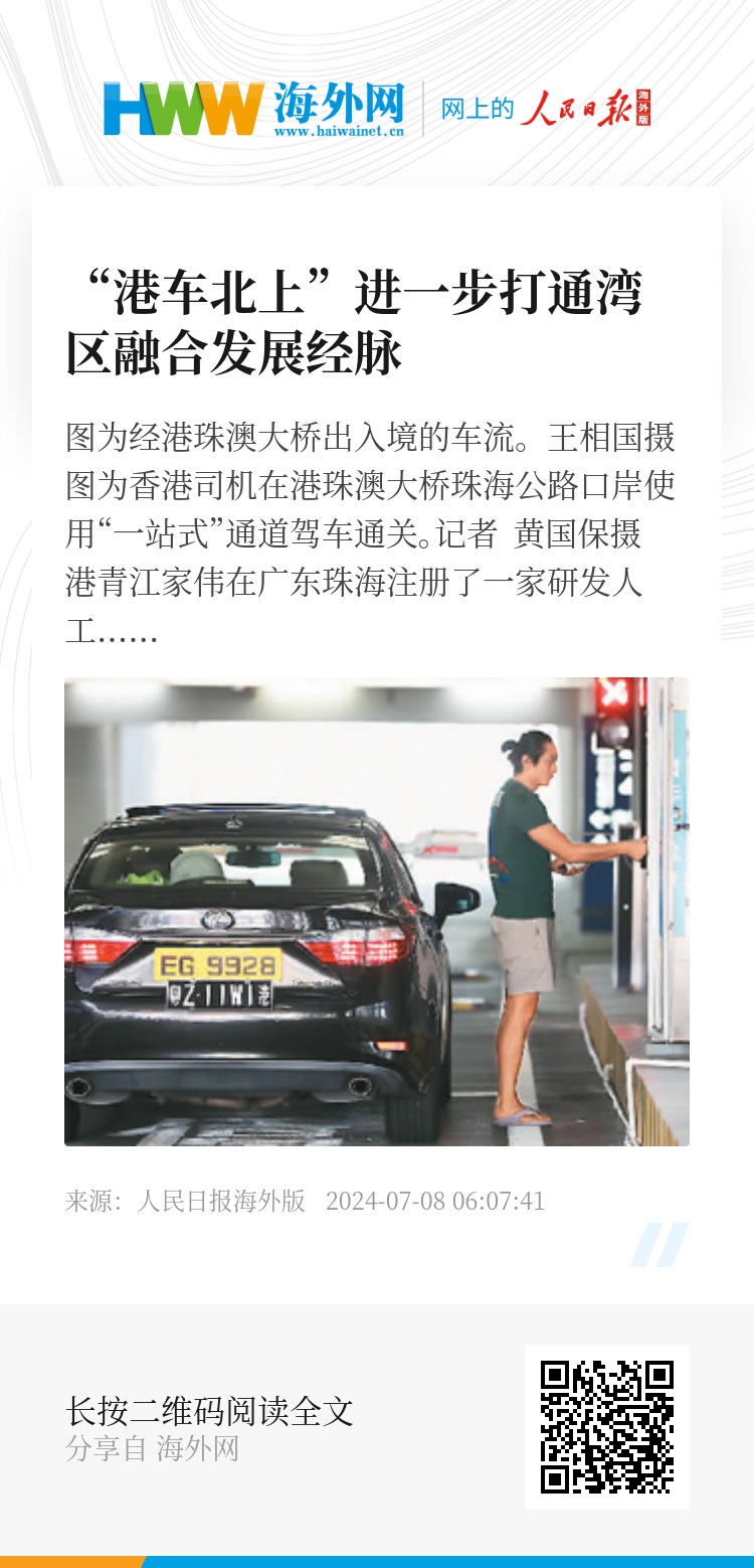 “港车北上”政策是中央支持香港发展,推进粤港澳大湾区建设的重要举措之一。据港珠澳大桥边检站数据显示,截至7月7日下午,经港珠澳大桥出入境的香港单牌车突破100万辆次。