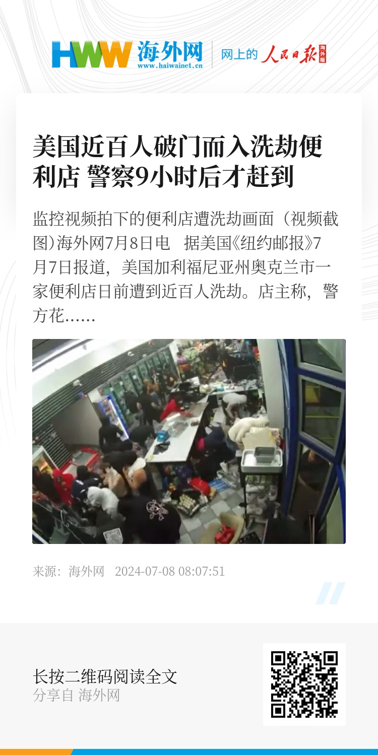 海外网7月8日电 据美国《纽约邮报》7月7日报道,美国加利福尼亚州奥克兰市一家便利店日前遭到近百人洗劫。店主称,警方花费了9小时后才派人前往现场。