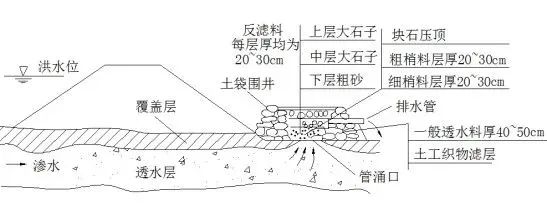 反滤围井:管涌点涌水量偏大时,适当清除涌水口周边杂物、淤泥,用土(砂)袋做成围井,井壁与地面较好接触,在围井内分层铺设滤料,反滤层厚度(围井高度)以涌水流出而不挟带泥沙为准。