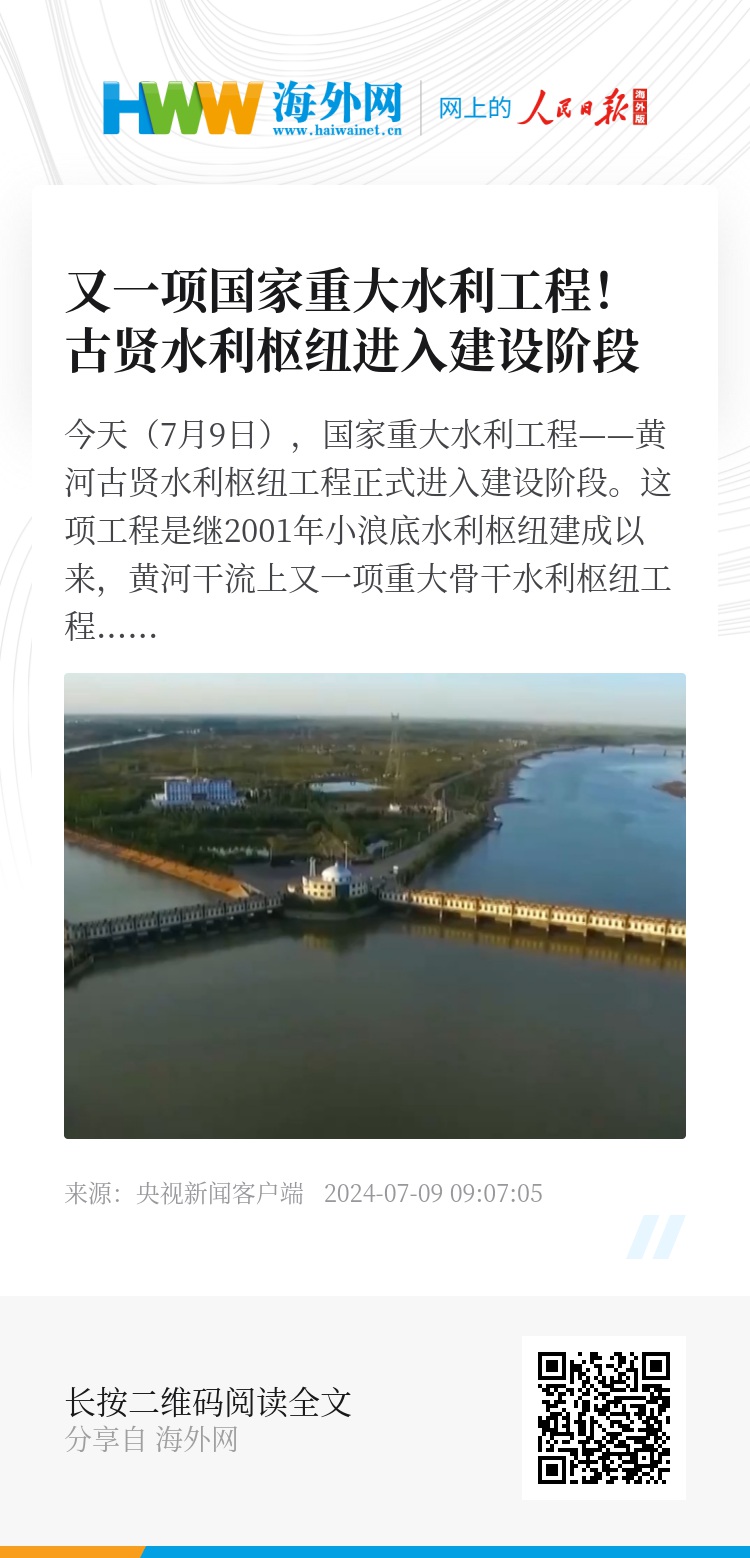 今天(7月9日),国家重大水利工程——黄河古贤水利枢纽工程正式进入建设阶段。这项工程是继2001年小浪底水利枢纽建成以来,黄河干流上又一项重大骨干水利枢纽工程。