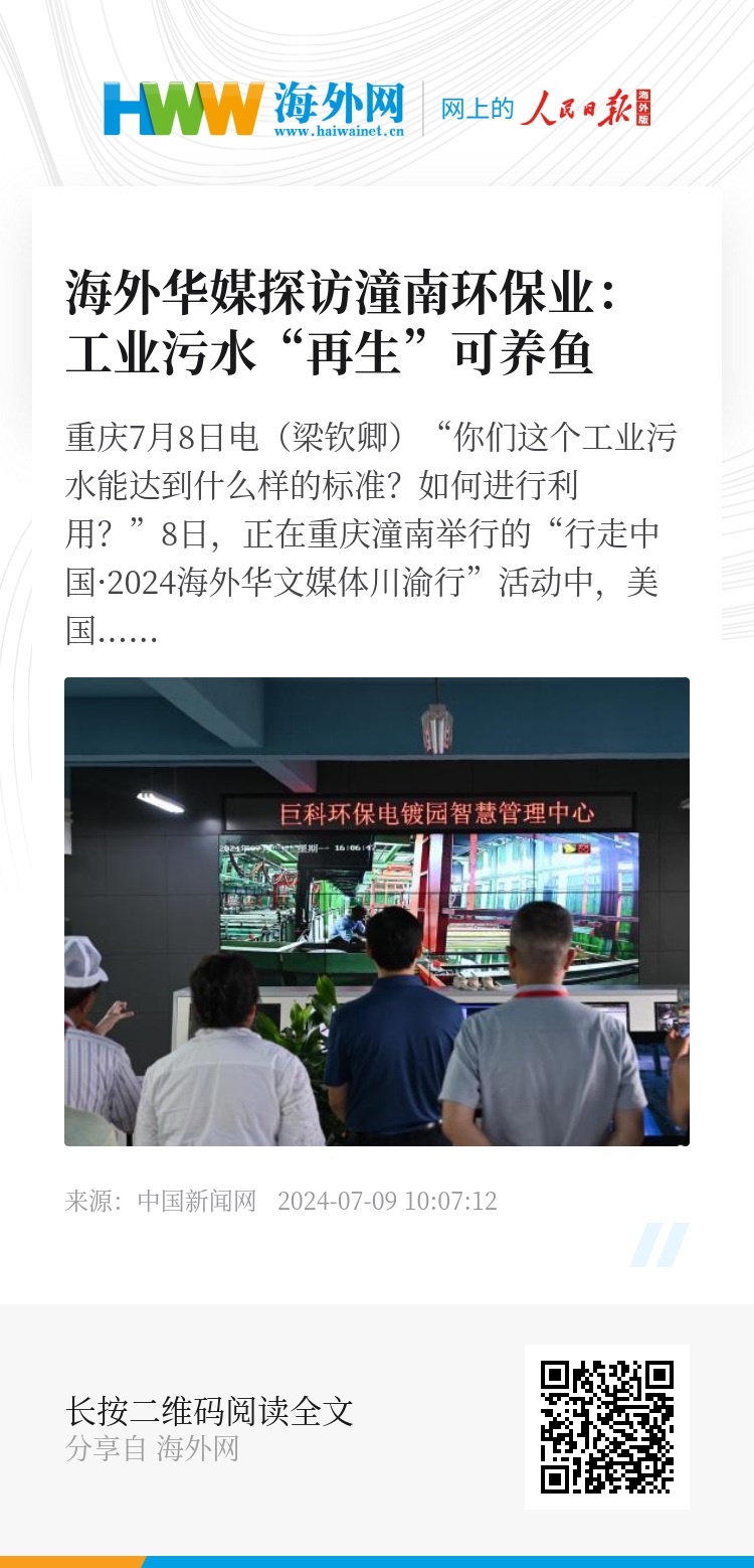 中新网重庆7月8日电(梁钦卿)“你们这个工业污水能达到什么样的标准?如何进行利用?”8日,正在重庆潼南举行的“行走中国·2024海外华文媒体川渝行”活动中,美国《中美邮报》社长屠新时如此问道。