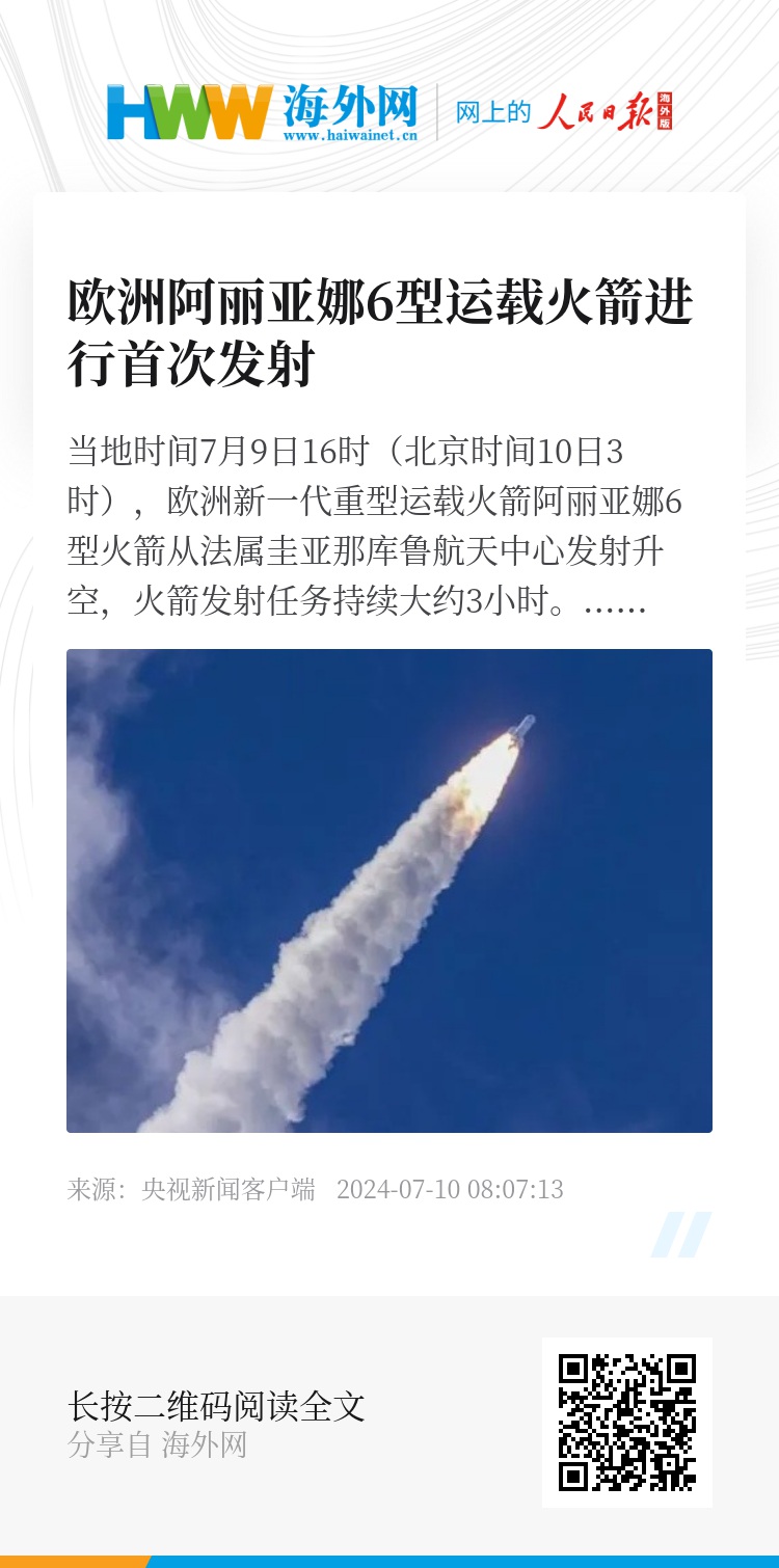 当地时间7月9日16时(北京时间10日3时),欧洲新一代重型运载火箭阿丽亚娜6型火箭从法属圭亚那库鲁航天中心发射升空,火箭发射任务持续大约3小时。