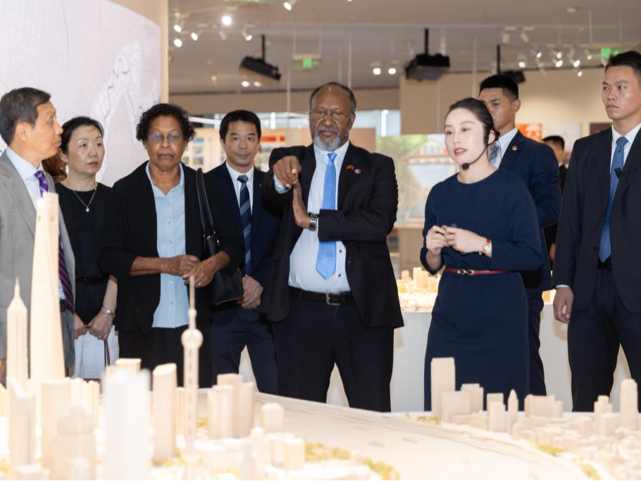 7月9日,瓦努阿图共和国总理夏洛特·萨尔维在上海城市规划展示馆参观。新华社记者 王翔 摄