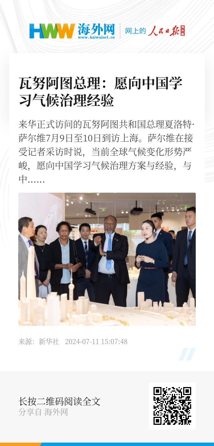 来华正式访问的瓦努阿图共和国总理夏洛特·萨尔维7月9日至10日到访上海。萨尔维在接受记者采访时说,当前全球气候变化形势严峻,愿向中国学习气候治理方案与经验,与中国携手应对气候变化。