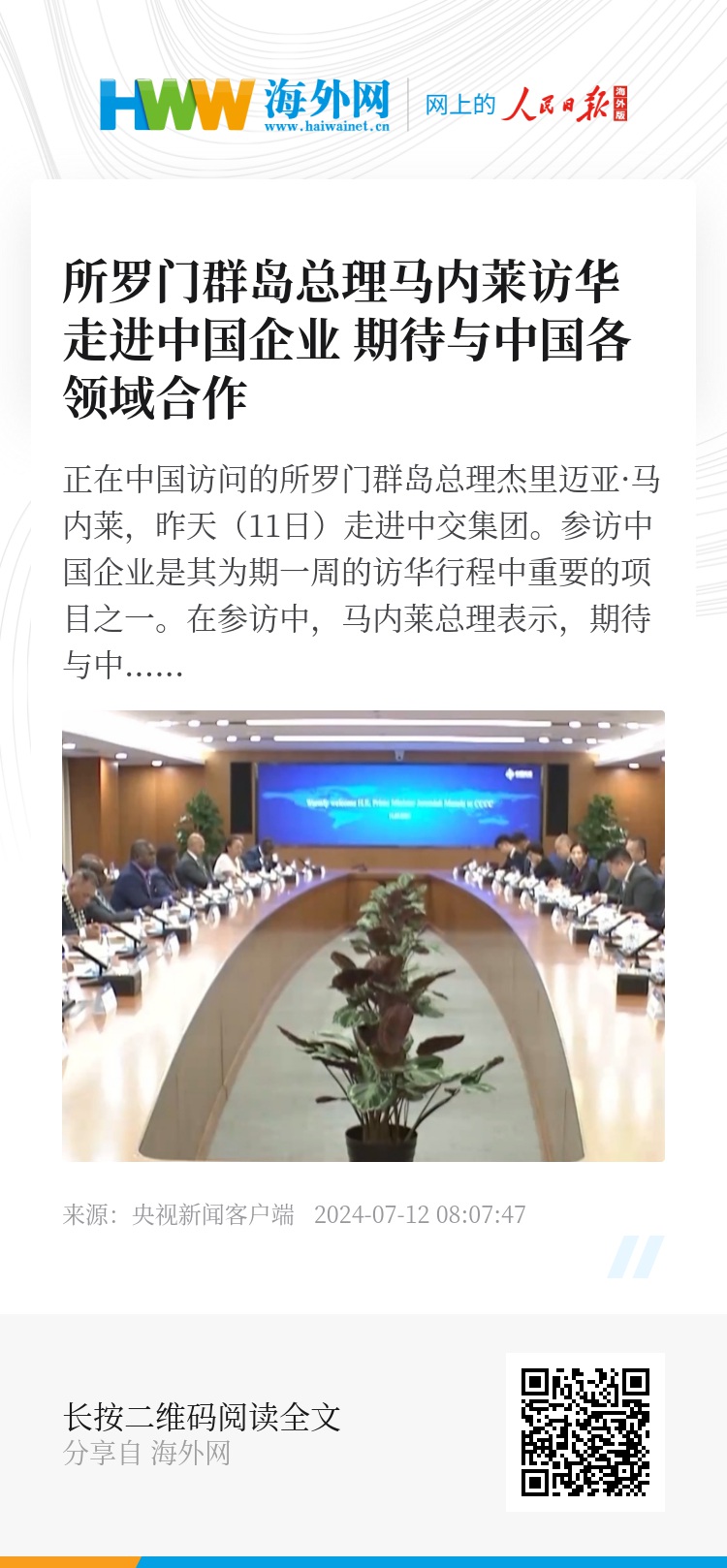正在中国访问的所罗门群岛总理杰里迈亚·马内莱,昨天(11日)走进中交集团。参访中国企业是其为期一周的访华行程中重要的项目之一。在参访中,马内莱总理表示,期待与中国推进基础设施建设、减贫、教育等领域合作。