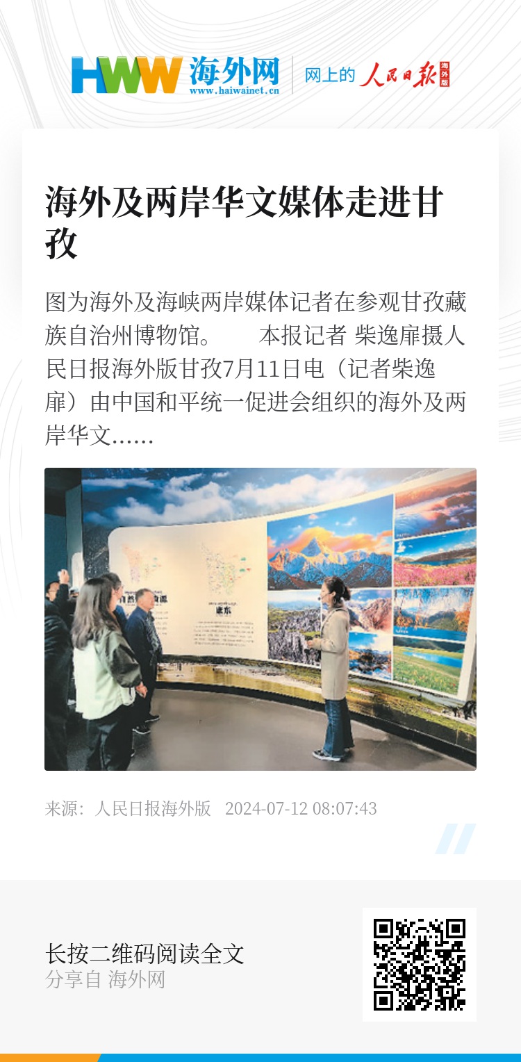 人民日报海外版甘孜7月11日电(记者柴逸扉)由中国和平统一促进会组织的海外及两岸华文媒体采风活动近日在四川省甘孜藏族自治州启动,来自美国、加拿大、埃及、肯尼亚等国家和海峡两岸的新闻媒体记者一行约30人参加活动。期间,采风团将一同走进高山峡谷、草原森林,体验甘孜的大美风光;探访藏族同胞聚居区,了解当地民族团结、经济发展、社会和谐的新貌。