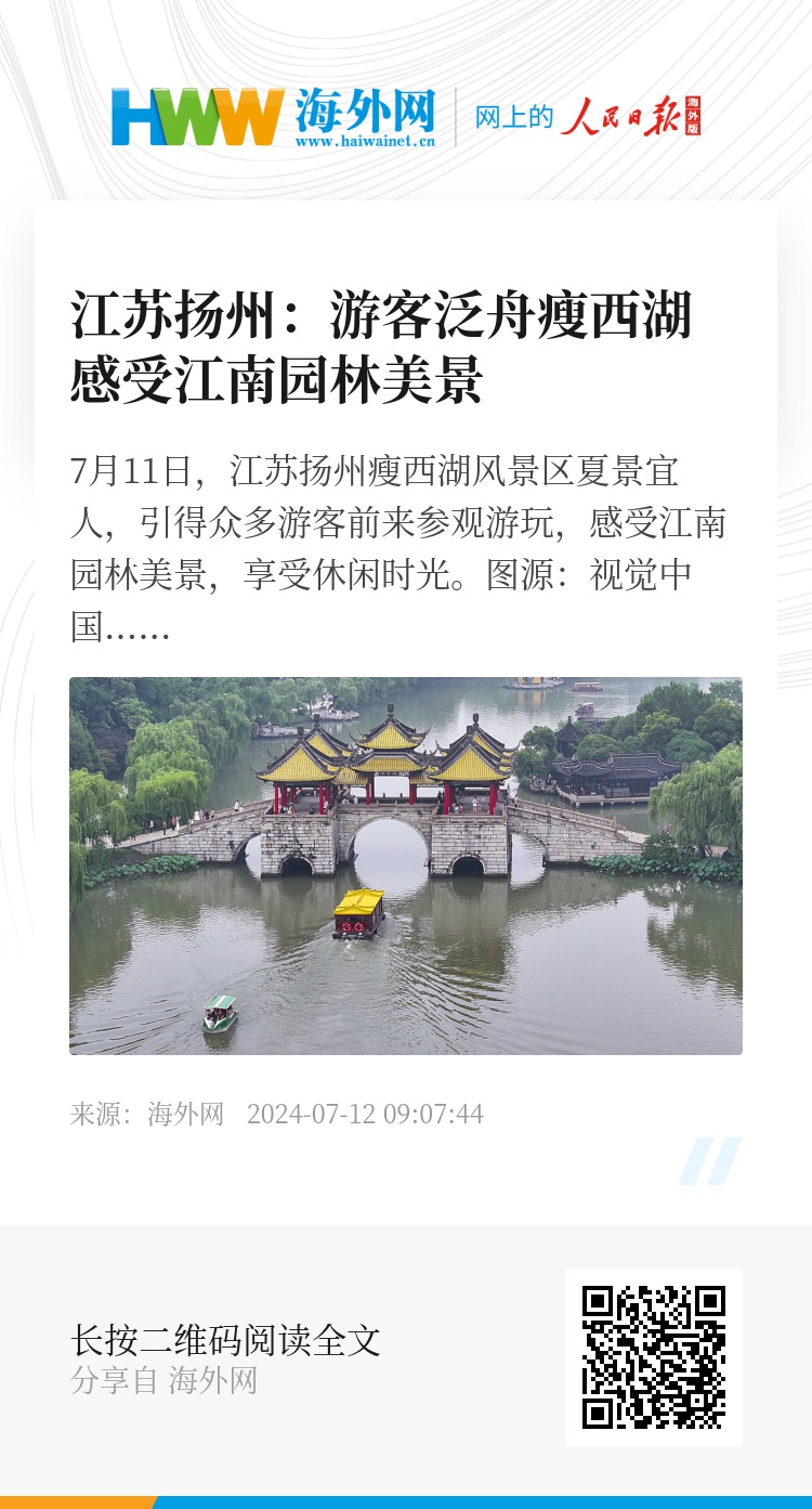 7月11日,江苏扬州瘦西湖风景区夏景宜人,引得众多游客前来参观游玩,感受江南园林美景,享受休闲时光。图源:视觉中国