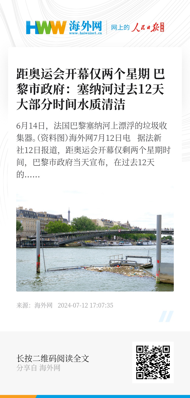 海外网7月12日电 据法新社12日报道,距奥运会开幕仅剩两个星期时间,巴黎市政府当天宣布,在过去12天的大部分时间里,塞纳河水质清洁,可以游泳。