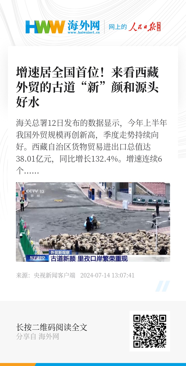 海关总署12日发布的数据显示,今年上半年我国外贸规模再创新高,季度走势持续向好。西藏自治区货物贸易进出口总值达38.01亿元,同比增长132.4%。增速连续6个月继续保持全国第一。那么在这些数据背后,都是哪些因素构成了西藏外贸增长的关键变量呢?一起走进雪域高原,探寻西藏自治区外贸增速的“含金量”,看西部边疆对外开放的新格局。