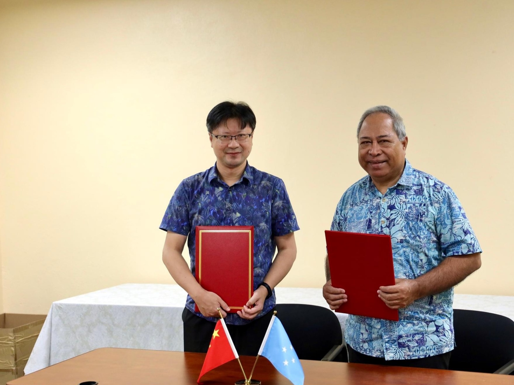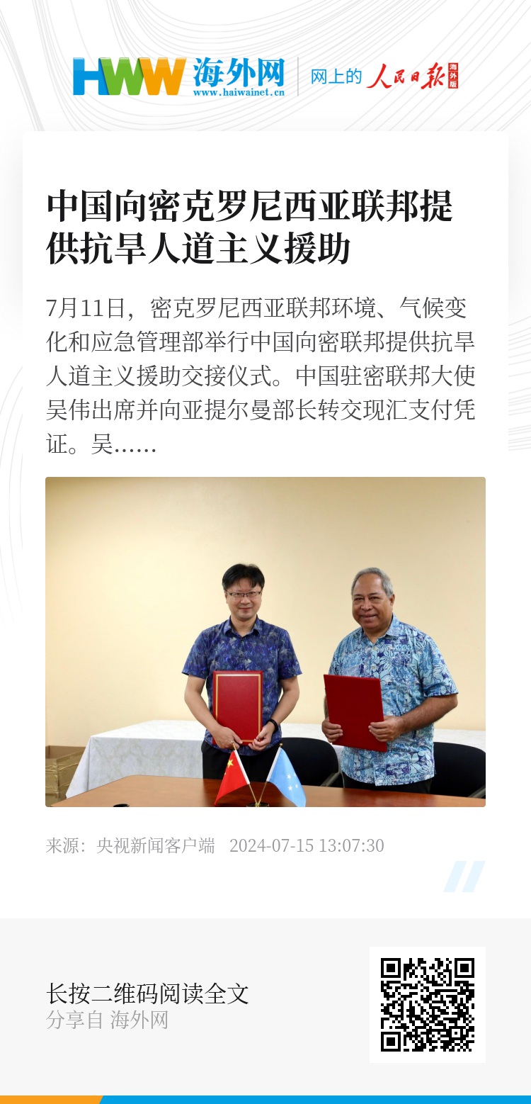 7月11日,密克罗尼西亚联邦环境、气候变化和应急管理部举行中国向密联邦提供抗旱人道主义援助交接仪式。中国驻密联邦大使吴伟出席并向亚提尔曼部长转交现汇支付凭证。