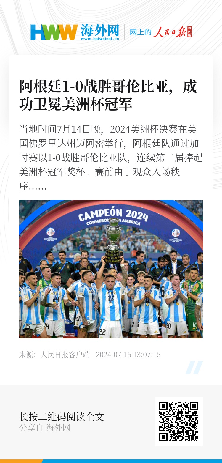 当地时间7月14日晚,2024美洲杯决赛在美国佛罗里达州迈阿密举行,阿根廷队通过加时赛以1-0战胜哥伦比亚队,连续第二届捧起美洲杯冠军奖杯。