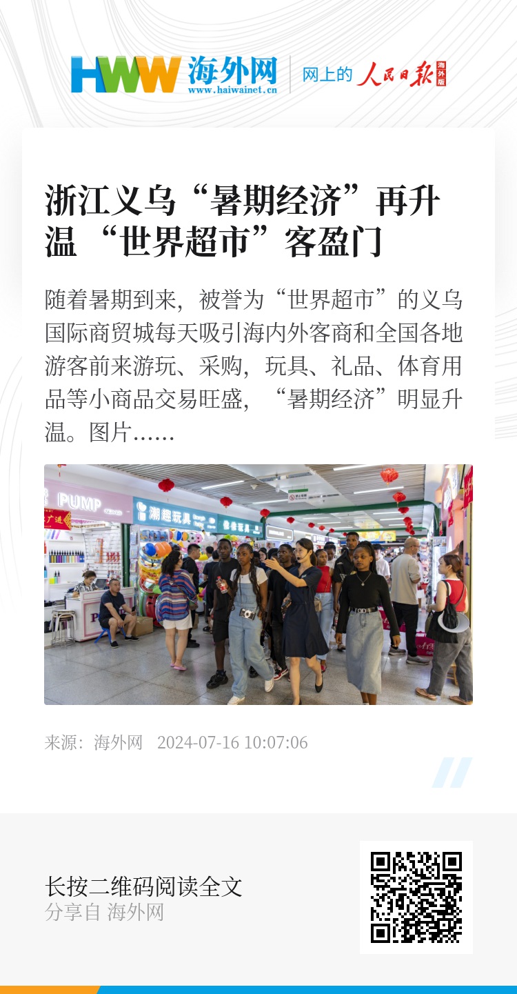 随着暑期到来,被誉为“世界超市”的义乌国际商贸城每天吸引海内外客商和全国各地游客前来游玩、采购,玩具、礼品、体育用品等小商品交易旺盛,“暑期经济”明显升温。图片来源:胡肖飞/视觉中国