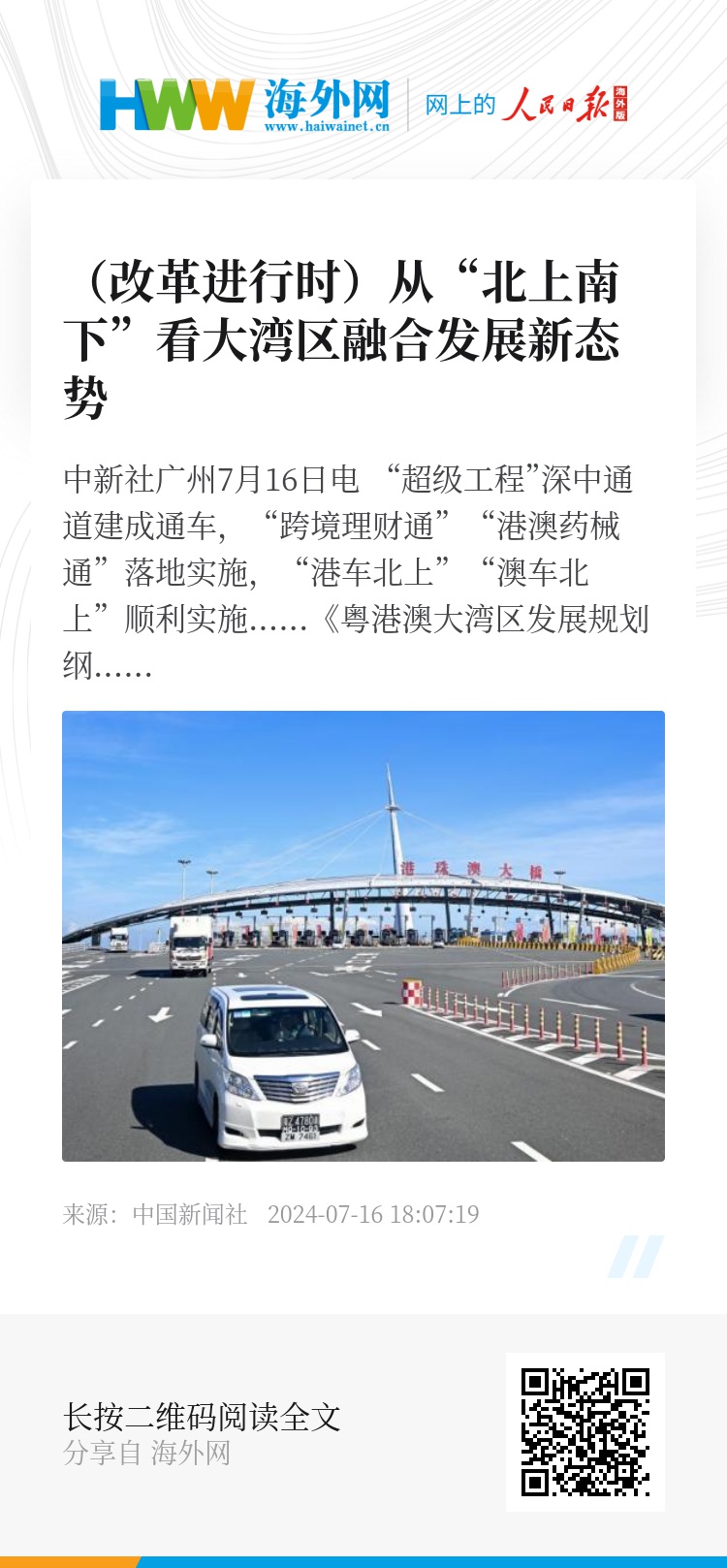 中新社广州7月16日电 “超级工程”深中通道建成通车,“跨境理财通”“港澳药械通”落地实施,“港车北上”“澳车北上”顺利实施......《粤港澳大湾区发展规划纲要》发布5年多以来,粤港澳大湾区高质量建设迈出坚实步伐,“硬联通”“软联通”持续加强,成为中国开放程度最高、经济活力最强的区域之一。