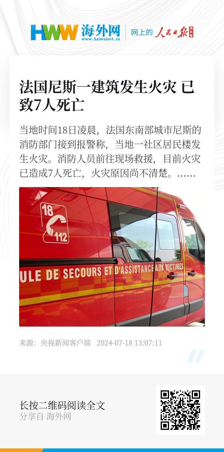 当地时间18日凌晨,法国东南部城市尼斯的消防部门接到报警称,当地一社区居民楼发生火灾。消防人员前往现场救援,目前火灾已造成7人死亡,火灾原因尚不清楚。