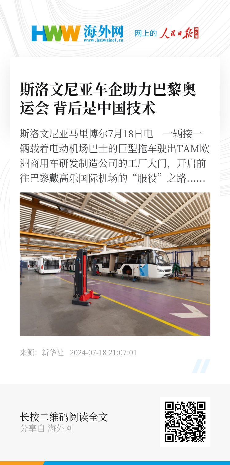 新华社斯洛文尼亚马里博尔7月18日电 一辆接一辆载着电动机场巴士的巨型拖车驶出TAM欧洲商用车研发制造公司的工厂大门,开启前往巴黎戴高乐国际机场的“服役”之路。这是记者日前在斯洛文尼亚第二大城市马里博尔郊区看到的情景,中国技术助力这家斯洛文尼亚民族品牌车企逐梦巴黎奥运会。
