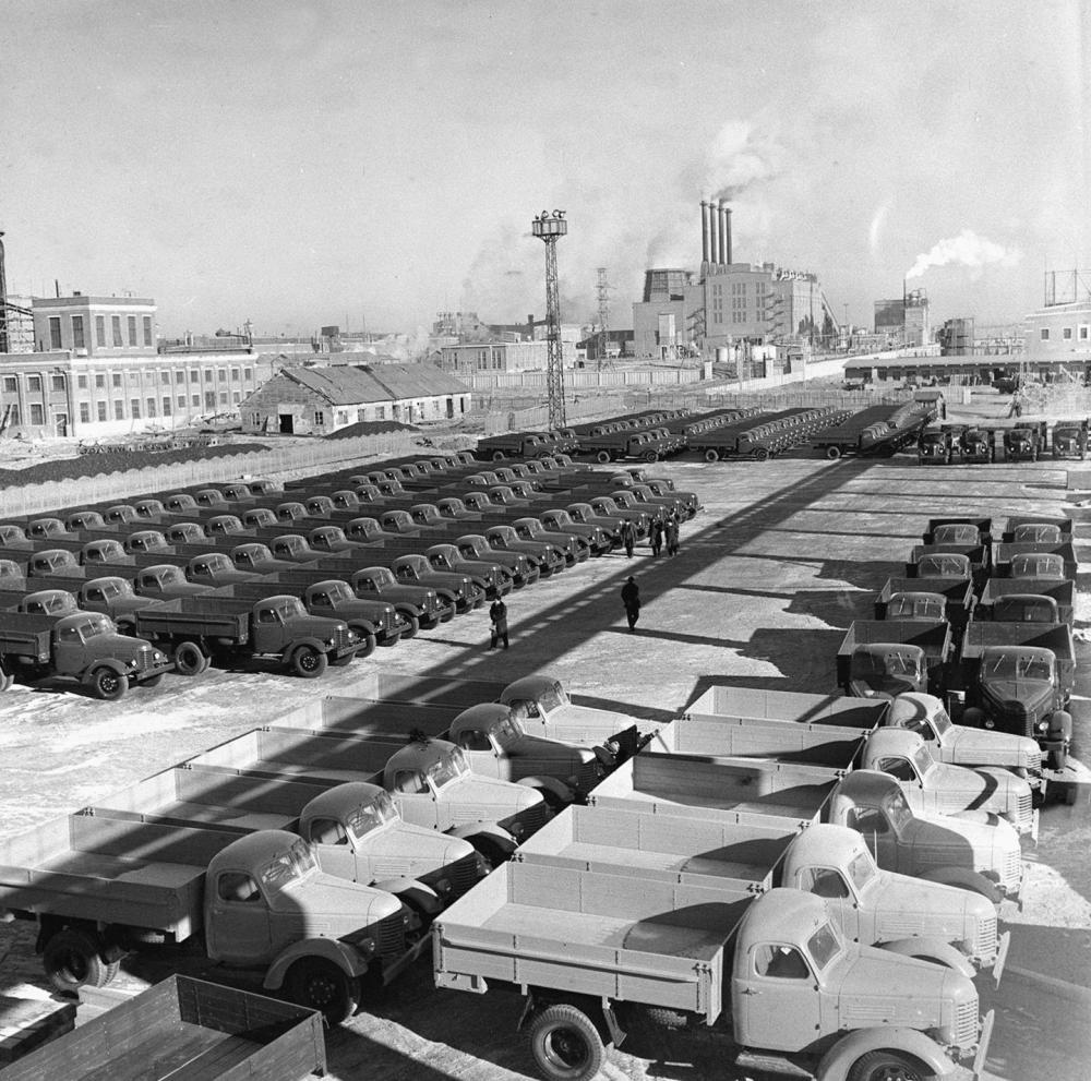 1957年,第一汽车制造厂停放的正待外运的解放牌卡车。