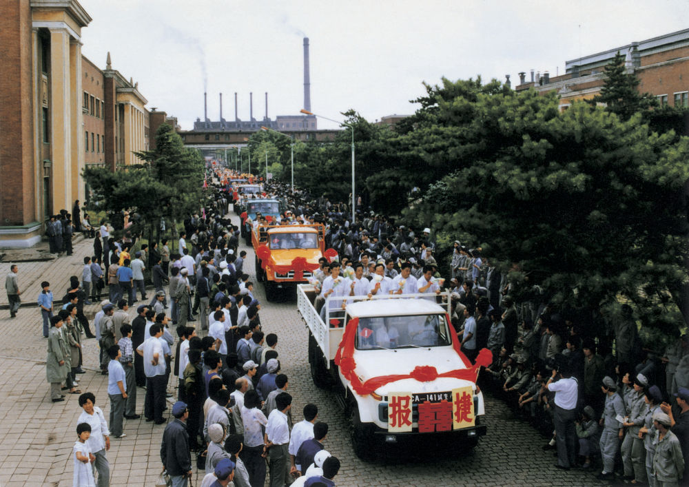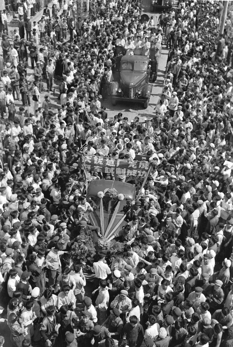 1956年7月14日,人们夹道欢迎第一汽车制造厂试制出的一批国产解放牌卡车。