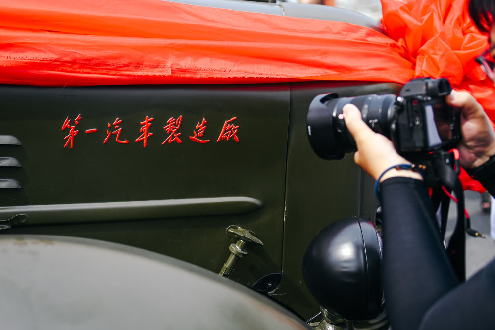 2023年6月26日,一名记者在拍摄第一代解放牌卡车(CA10)车身上的“第一汽车制造厂”字样标识。