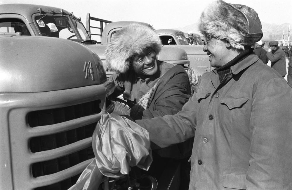 1985年,青海省果洛藏族自治州牧民扎杰(左)在新购买的解放牌卡车前和朋友交谈。