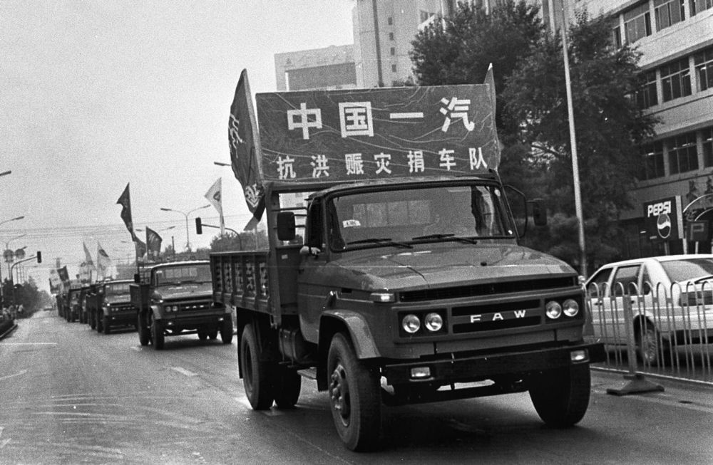 1998年8月19日,一汽职工捐赠购买的解放牌卡车开赴长江、嫩江抗洪一线。