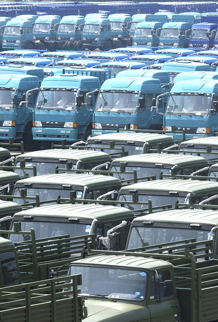2003年7月13日,中国一汽等待外运的解放牌卡车。
