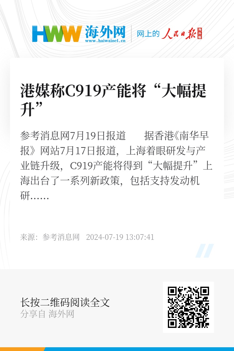 参考消息网7月19日报道 据香港《南华早报》网站7月17日报道,上海着眼研发与产业链升级,C919产能将得到“大幅提升”