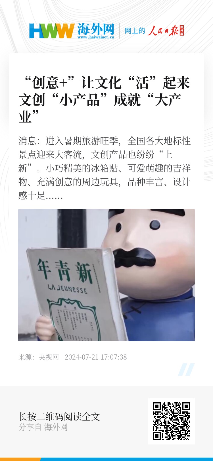 央视网消息:进入暑期旅游旺季,全国各大地标性景点迎来大客流,文创产品也纷纷“上新”。小巧精美的冰箱贴、可爱萌趣的吉祥物、充满创意的周边玩具,品种丰富、设计感十足的文创产品成为旅游消费的重要增长点。在这个暑假,哪些文创受欢迎?优秀的产品是怎么诞生的?文创产业链又有哪些新变化?来看记者在多地的采访。