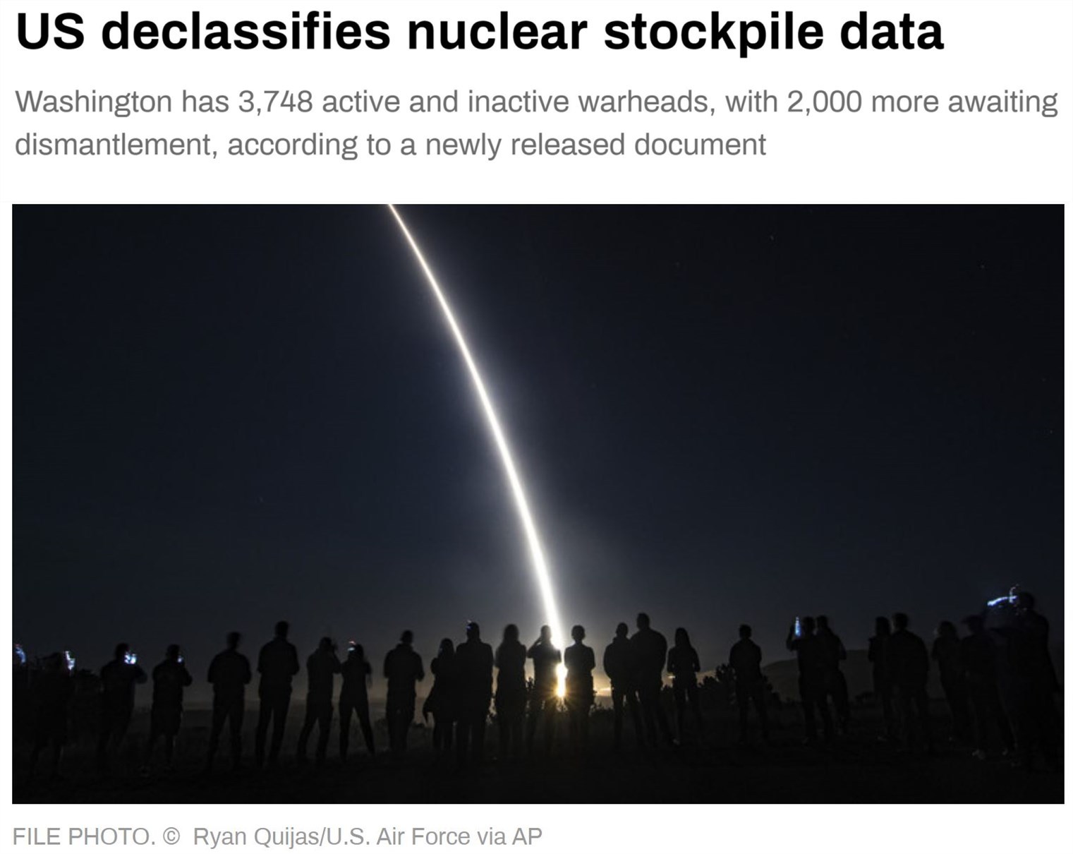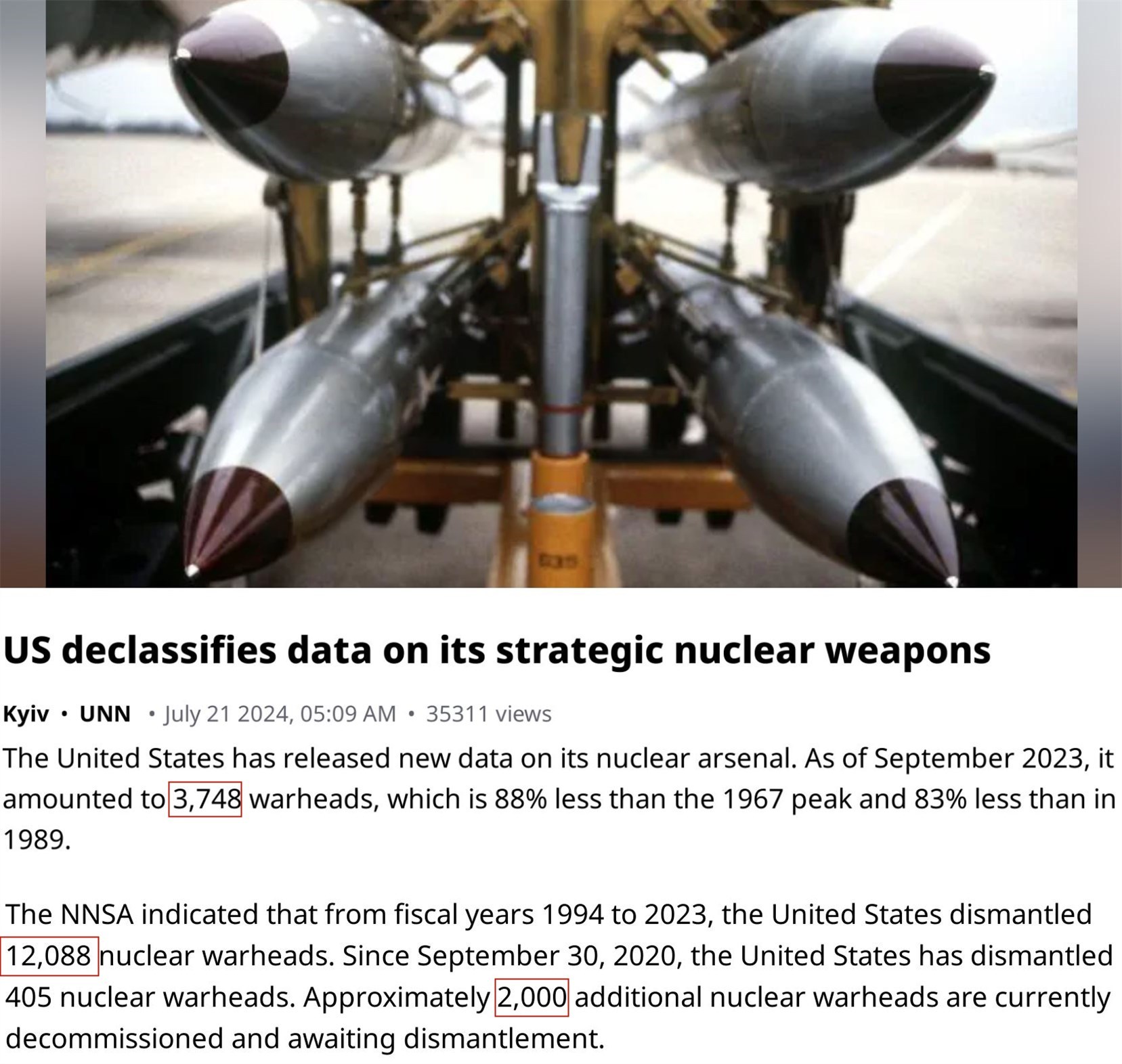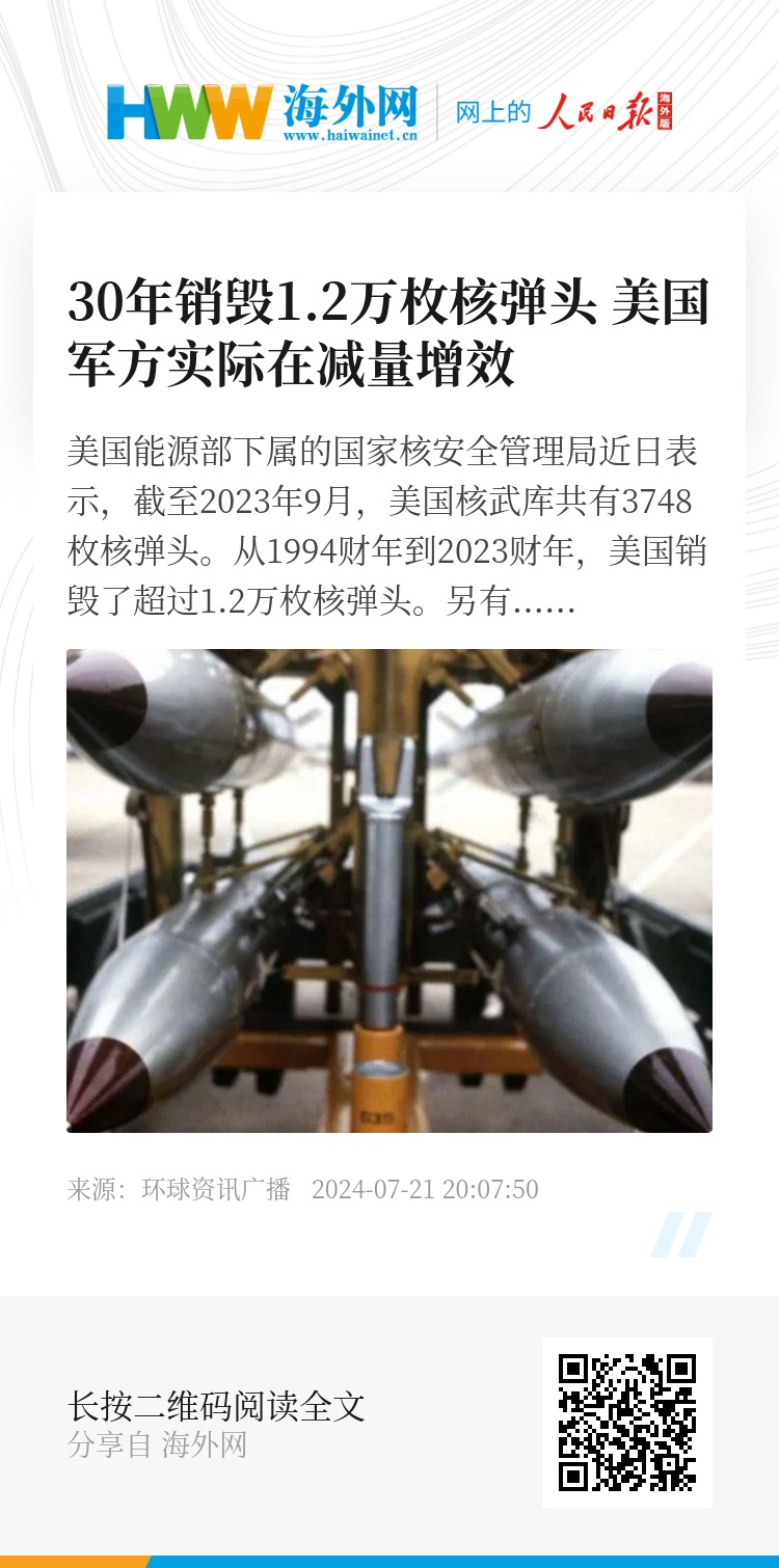 美国能源部下属的国家核安全管理局近日表示,截至2023年9月,美国核武库共有3748枚核弹头。从1994财年到2023财年,美国销毁了超过1.2万枚核弹头。另有2000枚核弹头已经淘汰并等待处置。