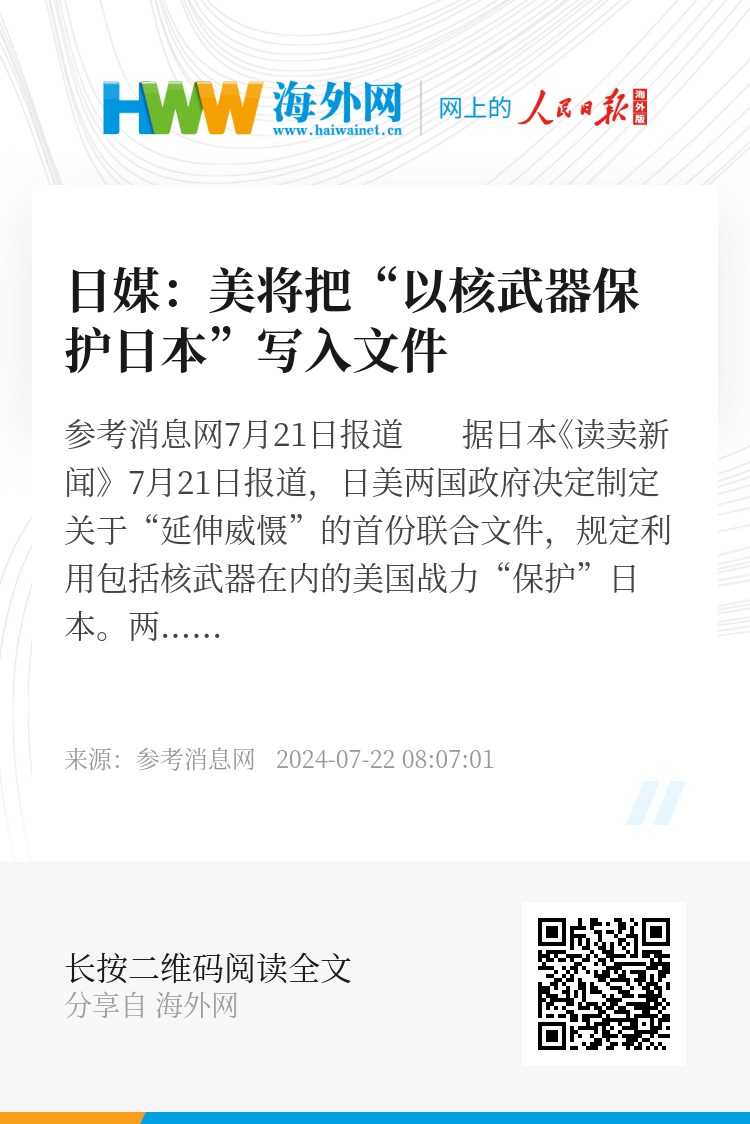参考消息网7月21日报道 据日本《读卖新闻》7月21日报道,日美两国政府决定制定关于“延伸威慑”的首份联合文件,规定利用包括核武器在内的美国战力“保护”日本。两国外长和防长将于本月下旬在东京举行磋商,就核遏制力等问题确认方向。
