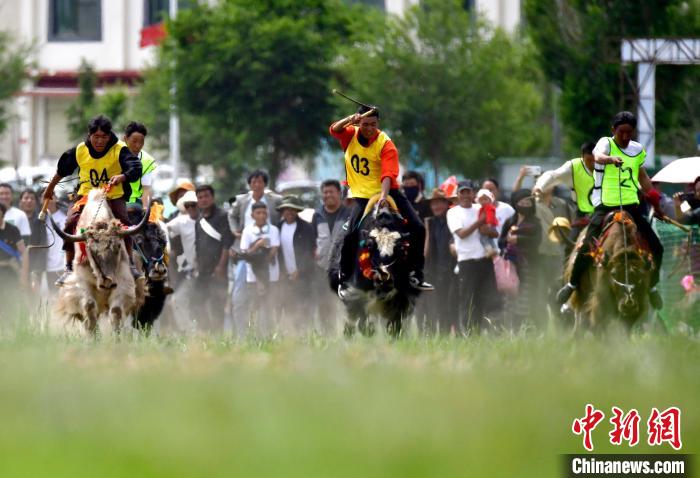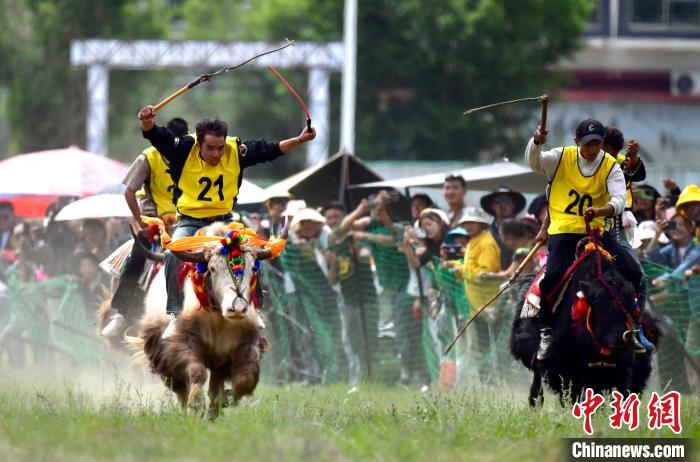 牦牛被誉为“高原之舟”,赛牦牛是藏族的传统体育项目。比赛现场,骑手们精神抖擞,待于起跑线;发令后即驭牛疾奔,以先到终点者为胜。赛场上竞争激烈;赛场外民众也为骑手们加油欢呼,比赛热闹非凡。
