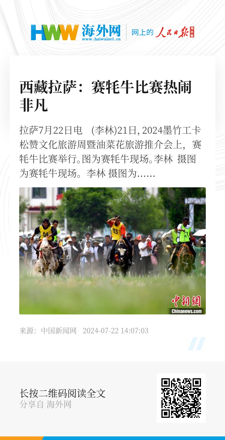中新网拉萨7月22日电 (李林)21日,2024墨竹工卡松赞文化旅游周暨油菜花旅游推介会上,赛牦牛比赛举行。