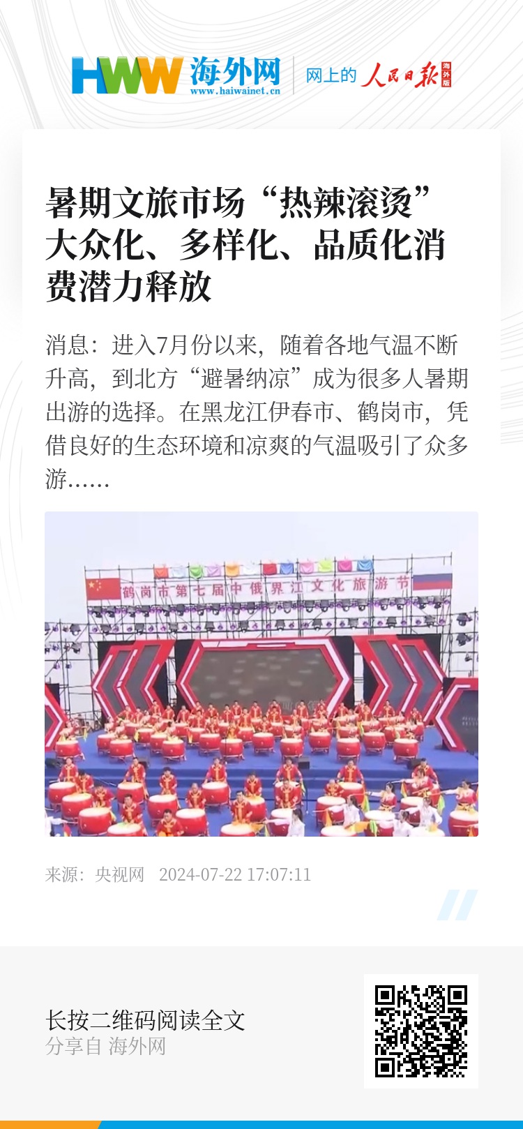 央视网消息:进入7月份以来,随着各地气温不断升高,到北方“避暑纳凉”成为很多人暑期出游的选择。在黑龙江伊春市、鹤岗市,凭借良好的生态环境和凉爽的气温吸引了众多游客,当地还打造文旅新业态、新场景来丰富游客的旅游体验。
