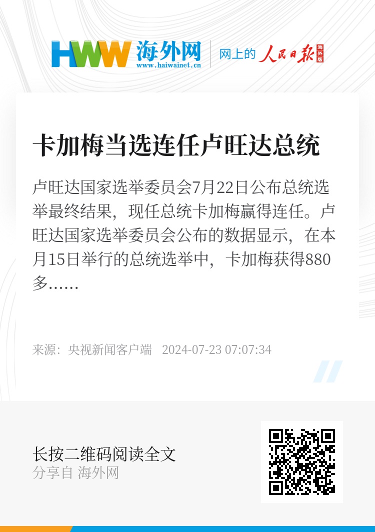 卢旺达国家选举委员会7月22日公布总统选举最终结果,现任总统卡加梅赢得连任。