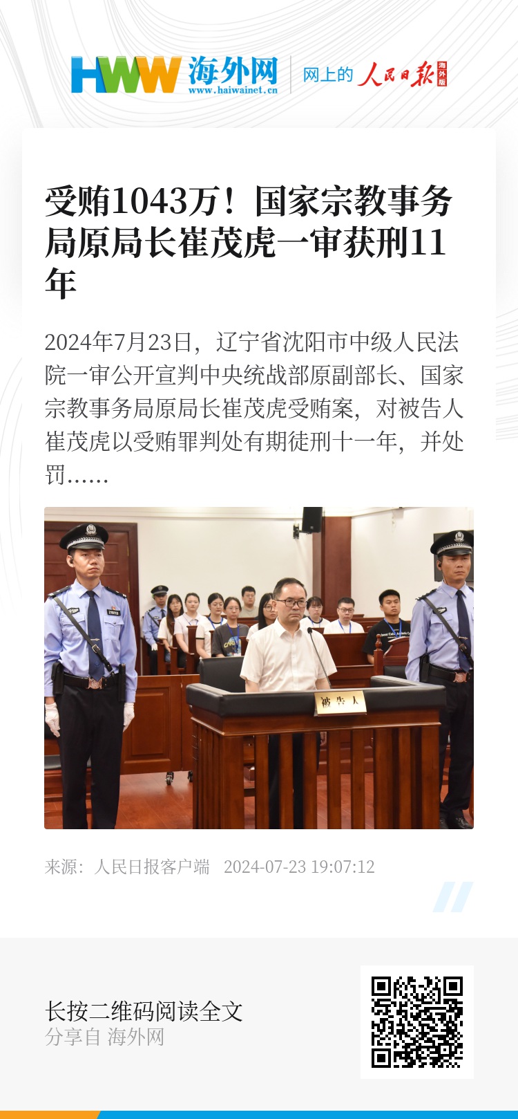 2024年7月23日,辽宁省沈阳市中级人民法院一审公开宣判中央统战部原副部长、国家宗教事务局原局长崔茂虎受贿案,对被告人崔茂虎以受贿罪判处有期徒刑十一年,并处罚金人民币一百五十万元;对查封、扣押在案的崔茂虎犯罪所得财物及其孳息依法予以追缴,上缴国库,不足部分继续追缴。