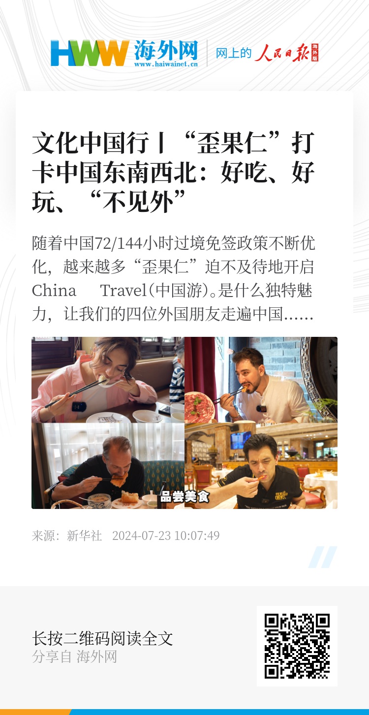 随着中国72/144小时过境免签政策不断优化,越来越多“歪果仁”迫不及待地开启China Travel(中国游)。是什么独特魅力,让我们的四位外国朋友走遍中国东南西北,大呼“Amazing(令人惊喜)”!