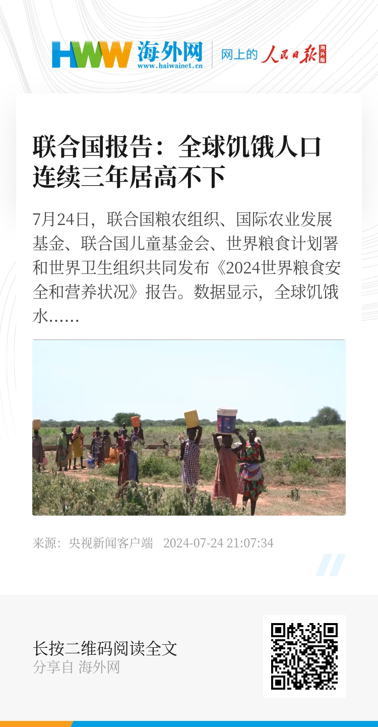 7月24日,联合国粮农组织、国际农业发展基金、联合国儿童基金会、世界粮食计划署和世界卫生组织共同发布《2024世界粮食安全和营养状况》报告。数据显示,全球饥饿水平连续第三年居高不下,2023年全球有7.13亿至7.57亿人面临饥饿,比2019年增加约1.52亿人。相当于全球每11人中就有1人面临饥饿。