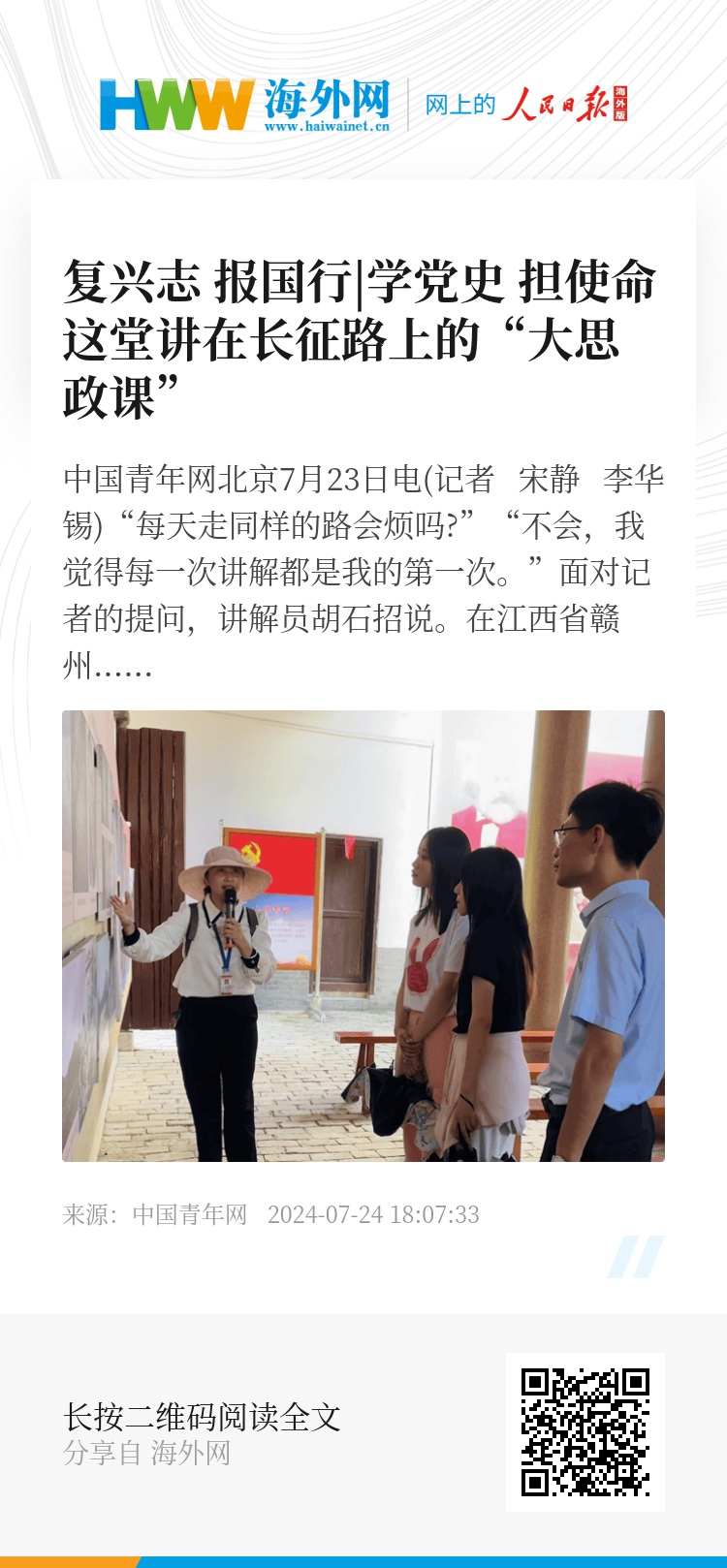 “每一代人有每一代人的长征路,在赣南这片红色土地上,许许多多的红军后代们在各自的领域发光发热,他们牢记嘱托,把弘扬和传承红色基因深深植根于血脉之中,他们脚踏实地,用实际行动把家乡建设得更加美好。”彭潭悠告诉记者,回到学校后,她要把听到的革命故事讲给更多的同学们听,让同学们感受到这堂特殊的“大思政课”的魅力。