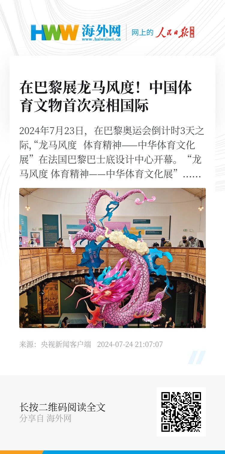2024年7月23日,在巴黎奥运会倒计时3天之际,“龙马风度 体育精神——中华体育文化展”在法国巴黎巴士底设计中心开幕。