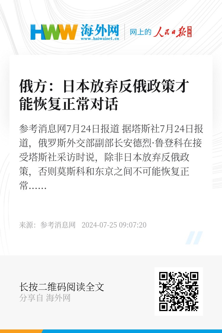 参考消息网7月24日报道 据塔斯社7月24日报道,俄罗斯外交部副部长安德烈·鲁登科在接受塔斯社采访时说,除非日本放弃反俄政策,否则莫斯科和东京之间不可能恢复正常对话。