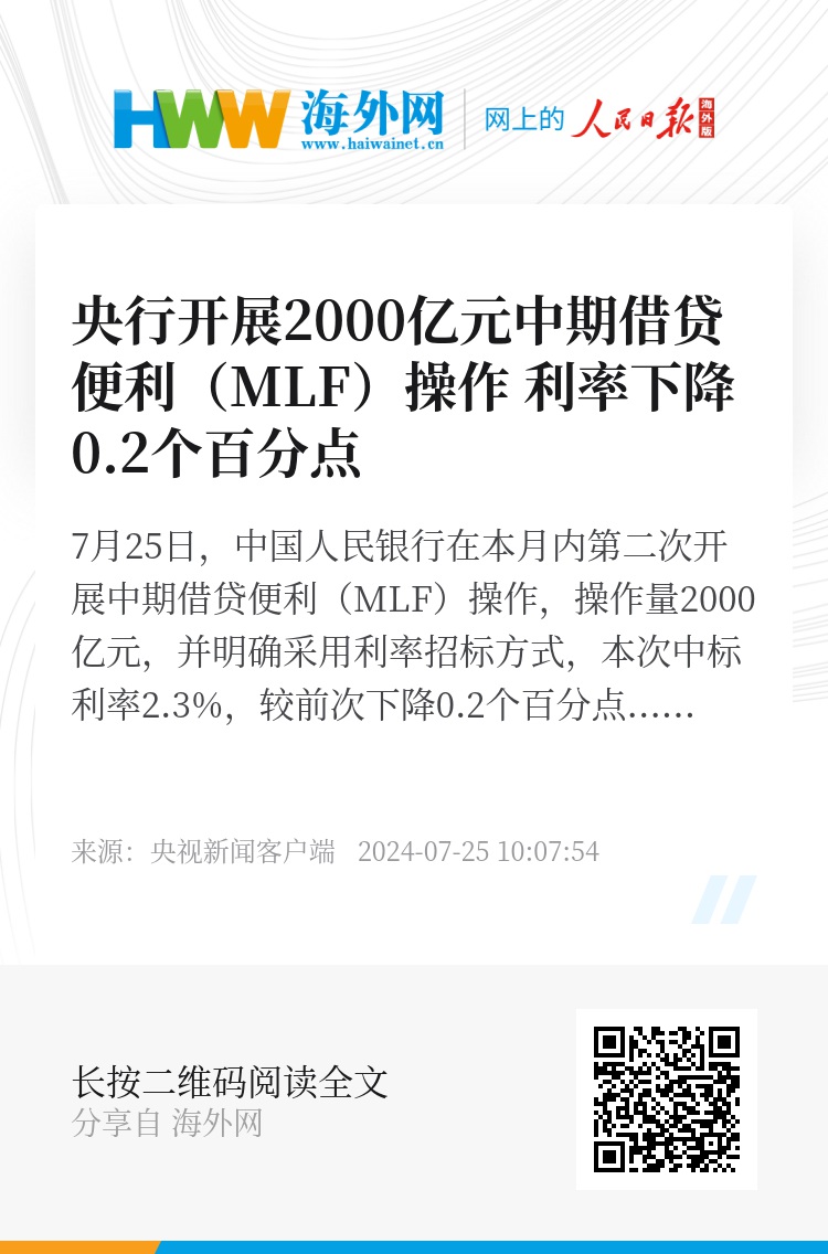 7月25日,中国人民银行在本月内第二次开展中期借贷便利(MLF)操作,操作量2000亿元,并明确采用利率招标方式,本次中标利率2.3%,较前次下降0.2个百分点。