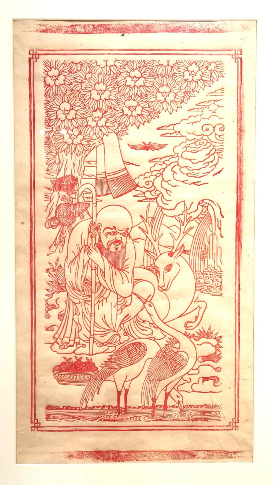 雕版拓片《六长寿》,印有长寿岩、长寿老人、长寿水、长寿树、长寿鹤、长寿鹿六样元素,是西藏经典的风俗画题材,其中长寿老人还有内地寿星形象的标志性凸额。由于寓意吉祥,它出现在唐卡、家用藏式柜彩画以及布达拉宫的壁画上。