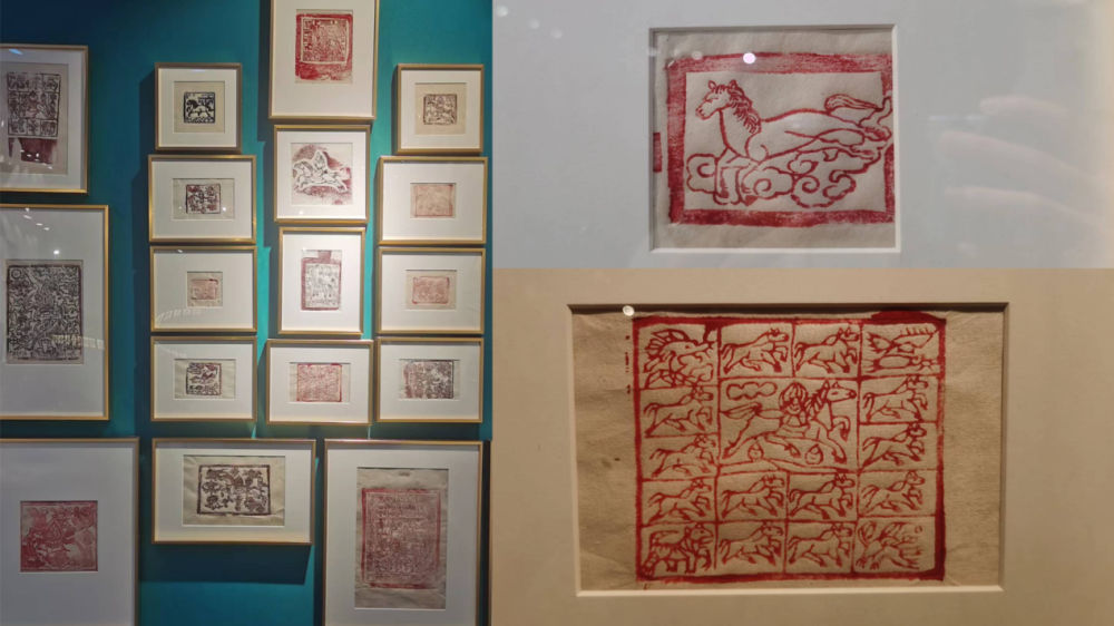 西藏悬挂山间、随风摇曳的成串彩旗,是从古象雄时期留传至今的祈福物——风马旗。一组来自西藏各地的17件拓片告诉观众:古代的风马旗以雕版拓印而成,其上绘马,有的肃立、有的飞奔,有的高傲、有的温驯,种种仪态不一,还有的和龙凤虎狮一起嬉戏。