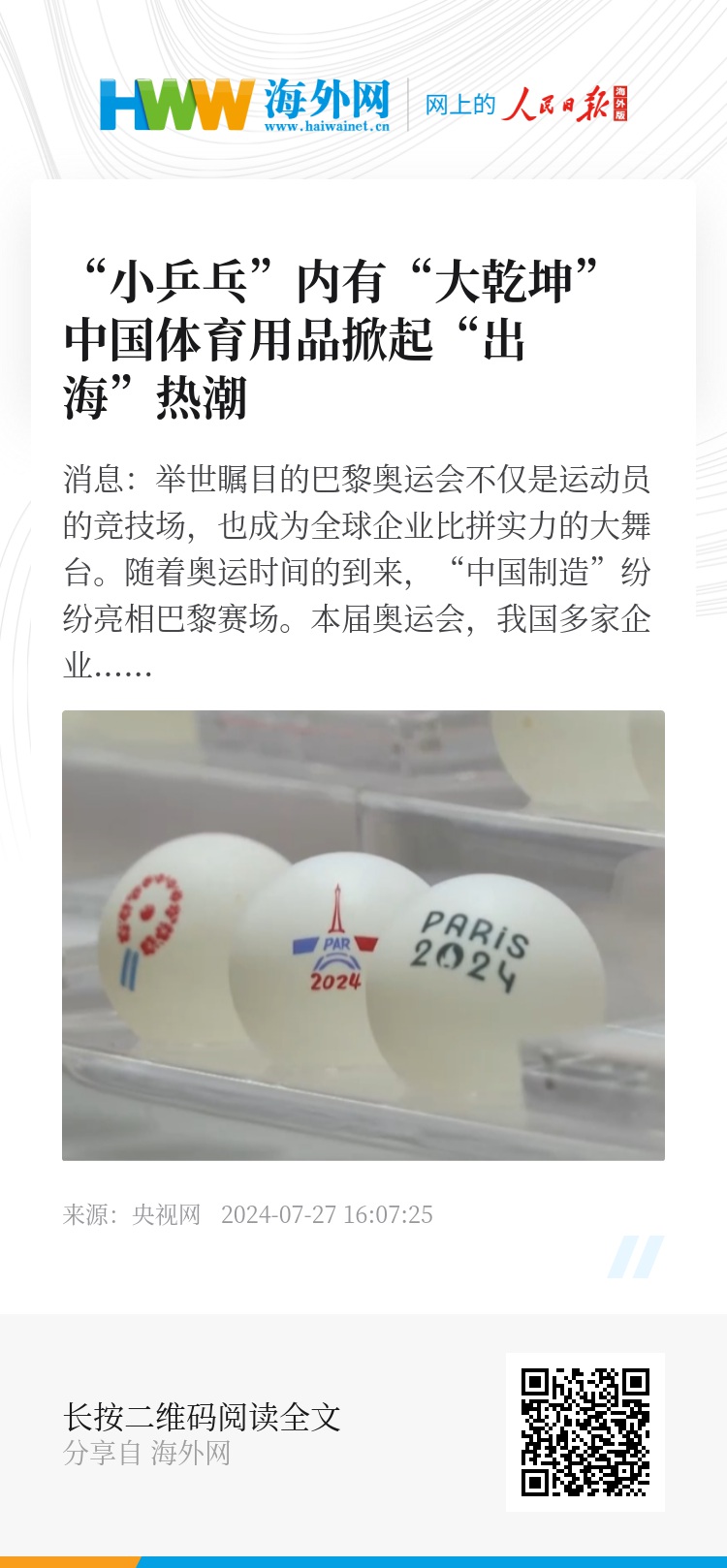 本届奥运会,我国多家企业为摔跤、拳击、柔道、自行车、跆拳道、体操等赛事项目提供体育器材。这款乒乓球就是2024年巴黎奥运会比赛官方指定用球,这家企业是巴黎奥运会官方指定的独家供应商。