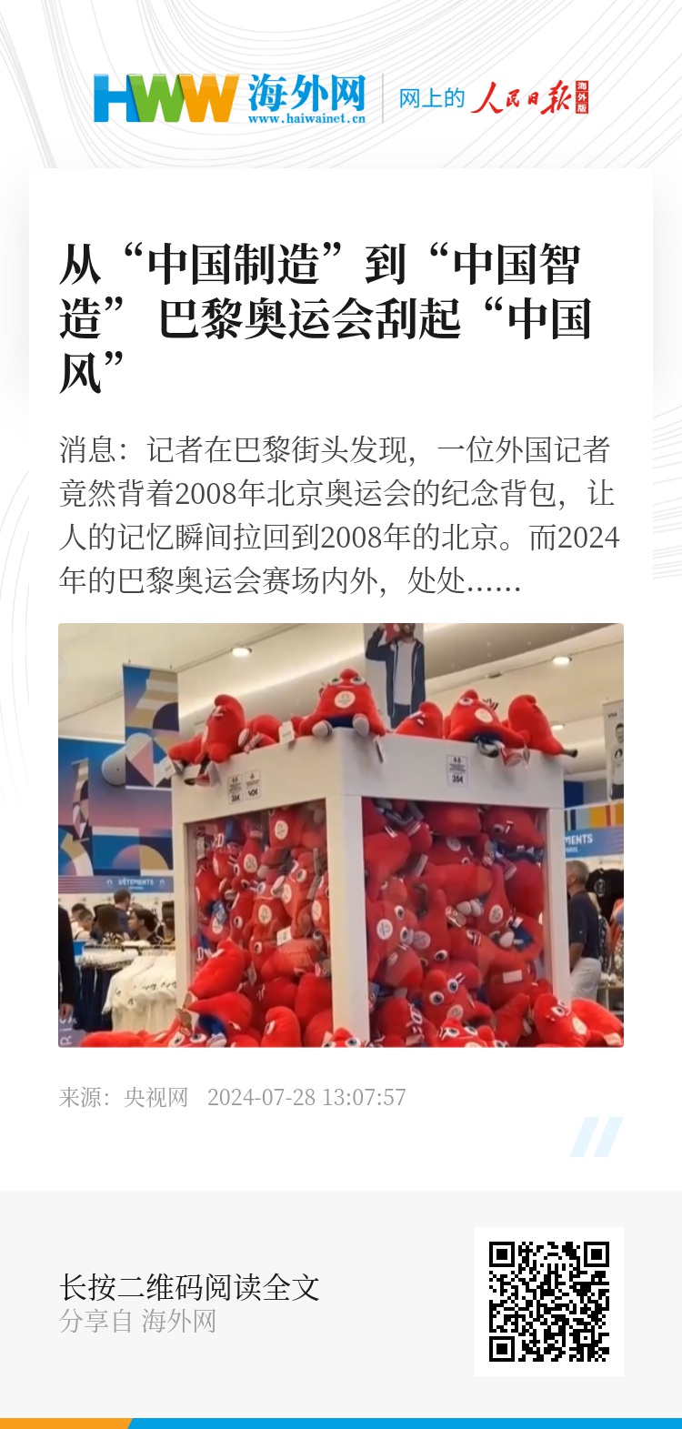 央视网消息:记者在巴黎街头发现,一位外国记者竟然背着2008年北京奥运会的纪念背包,让人的记忆瞬间拉回到2008年的北京。而2024年的巴黎奥运会赛场内外,处处充满着“中国制造”的气息。