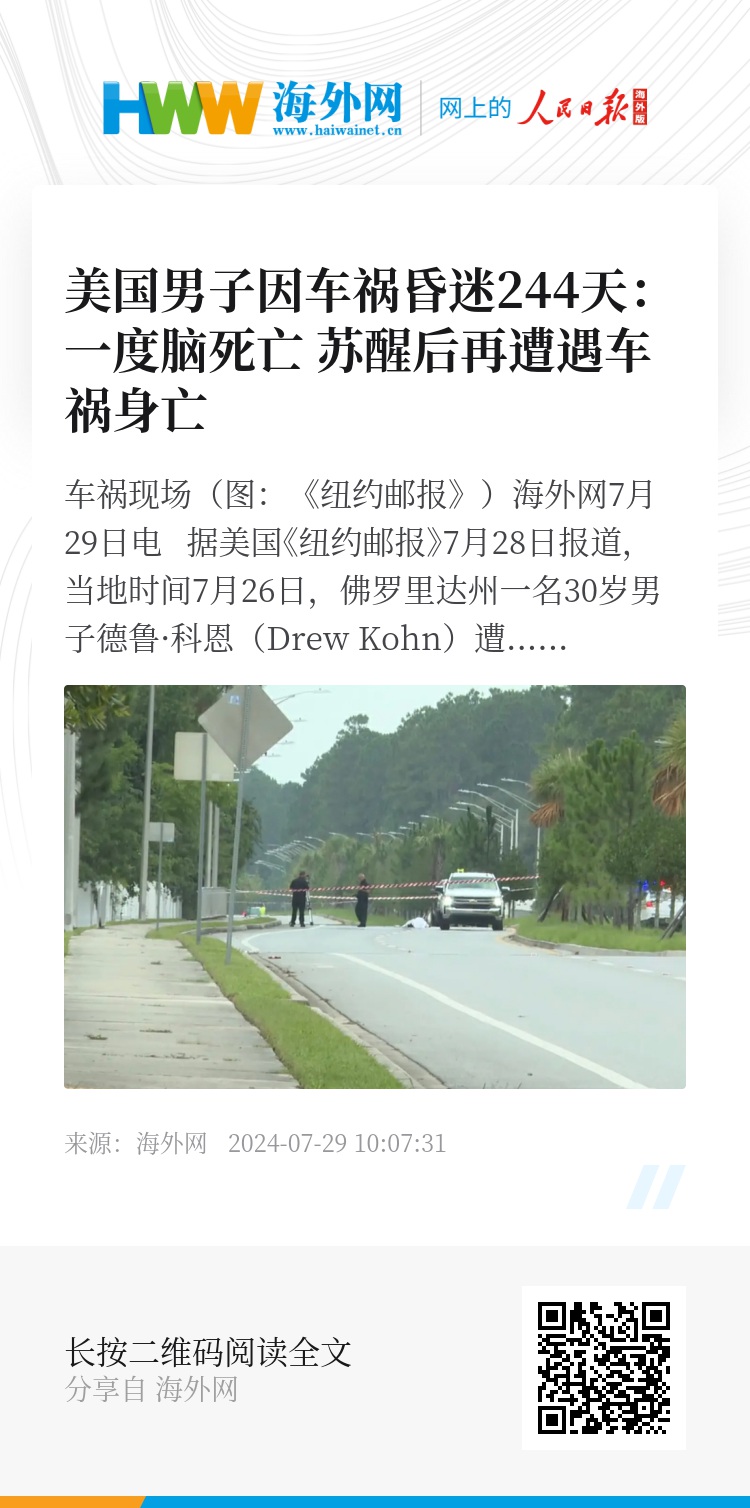 然而,杰克逊维尔警方表示,这个奇迹以令人心碎的结局告终,当地时间7月26日,德鲁在路上行走时被一辆皮卡车撞倒,不幸身亡。尽管心痛不已,德鲁的母亲还是表示,她很感激能与儿子共度7年时光。(海外网 李萌)