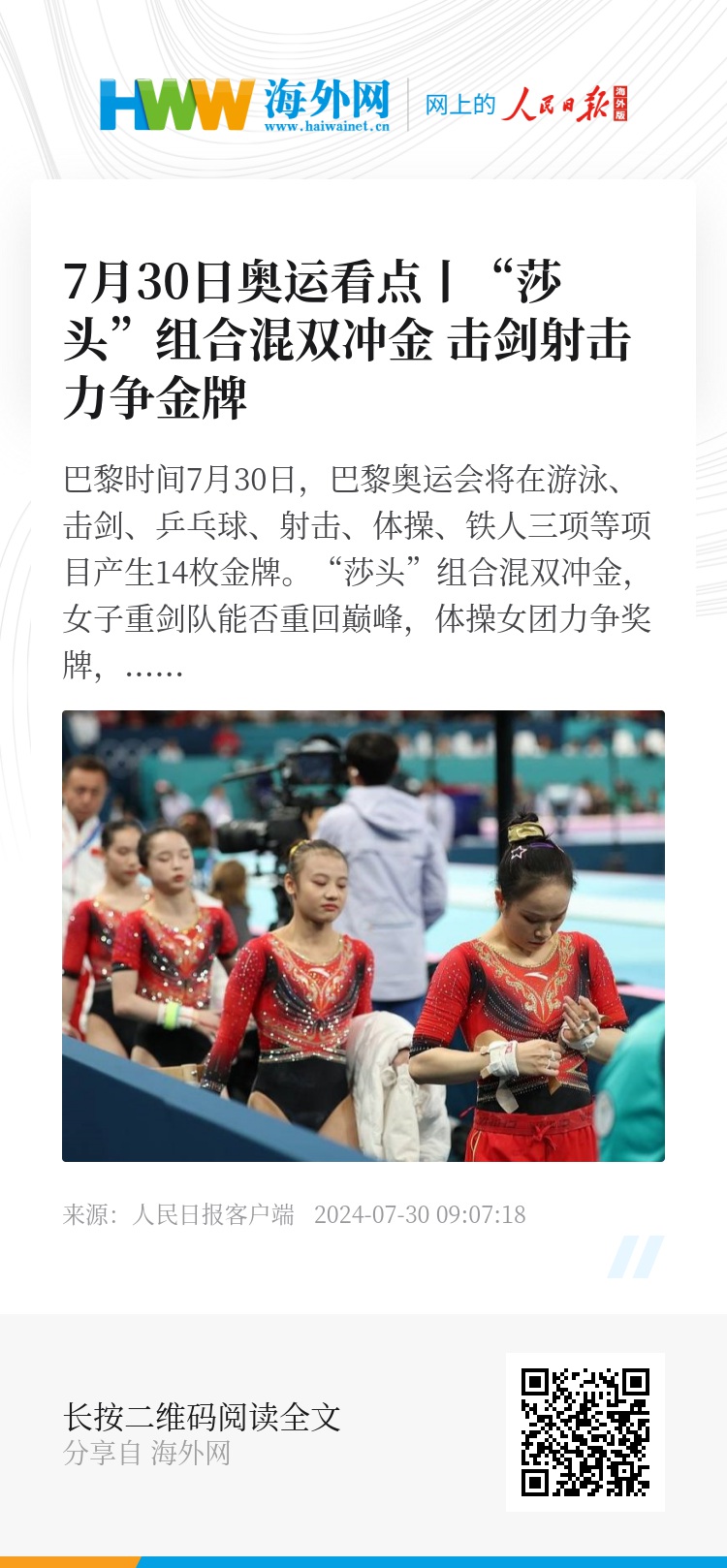 巴黎时间7月30日,巴黎奥运会将在游泳、击剑、乒乓球、射击、体操、铁人三项等项目产生14枚金牌。“莎头”组合混双冲金,女子重剑队能否重回巅峰,体操女团力争奖牌,这些看点值得关注。