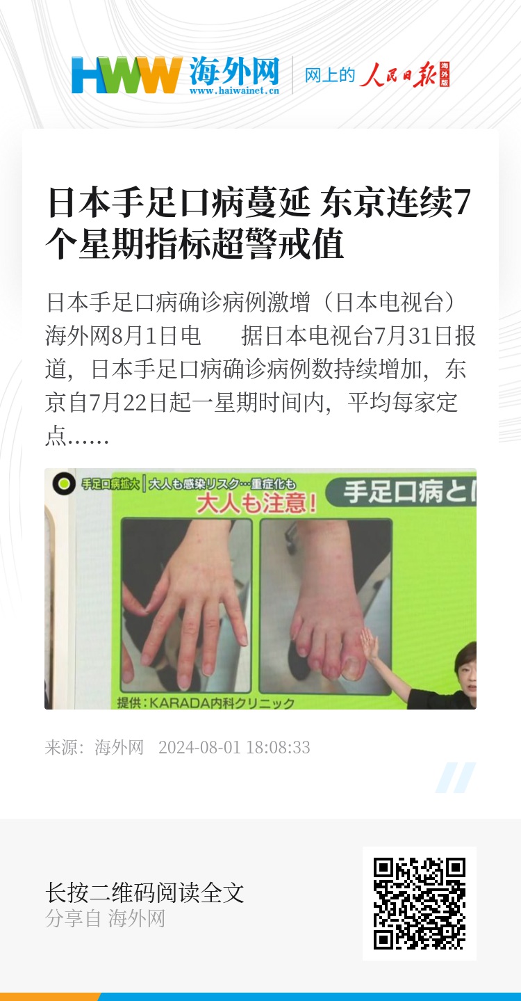 日本手足口病确诊病例激增(日本电视台)