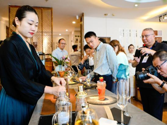在云茶品鉴院参观现场,调饮师以冷泡普洱茶、古树红茶、古树白茶等为基底,加冰、加果、加糖浆、加氮气,调制多款新式茶饮,展现云南茶的新表达。其中一款加氮气的冷泡滇红茶“雾霭”,受到朱新娥好评。